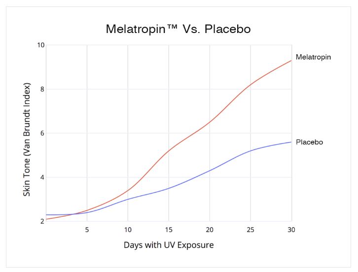 Melatropin™ is a novel [283.74mg/capsule] proprietary oral tanning compound. This double-blind, randomized, placebo-controlled study involved 72 healthy subjects [33 males, 39 females; Caucasian/European ancestry; mean age = 42.5 ± 21.5 years; skin tone (Van Brundt Index) 2.2 ± 1.1]. Subjects were directed to swallow 2 capsules of tanning compound (Melatropin™) or an identical-looking placebo twice daily: first dose in A.M. 1 hour after waking and second dose in P.M. 1 hour before bed. Subjects were instructed to receive UVR exposure (sun or tanning bed) 3 days per week, every other day for the duration of the 30 day study. Each subject reported to the Inpatient Unit in 5 day intervals for 30 days. Skin tone index was recorded on days 5, 10, 15, 20, 25, and 30. Subjects were asked to complete a questionnaire on day 1 regarding subjective normal tanning response. On day 30, subjects were asked to complete a second questionnaire regarding tanning experience during the 30 day study period.