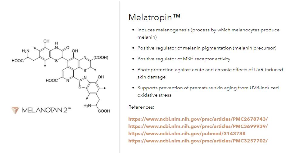 Melatropin™ acts to stimulate melanogenesis, inducing melanocytes to produce more melanin than they otherwise would. As a result, it has profound tanning effects when used in conjunction with UV exposure.
